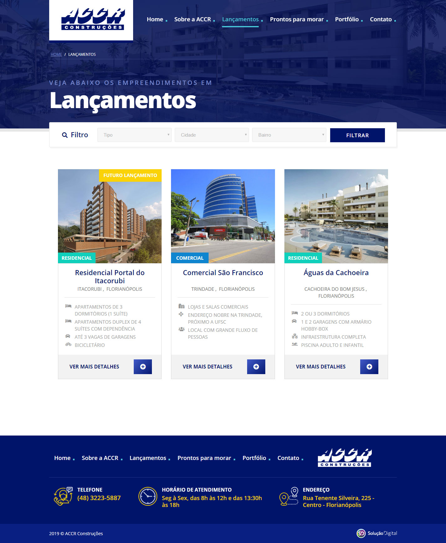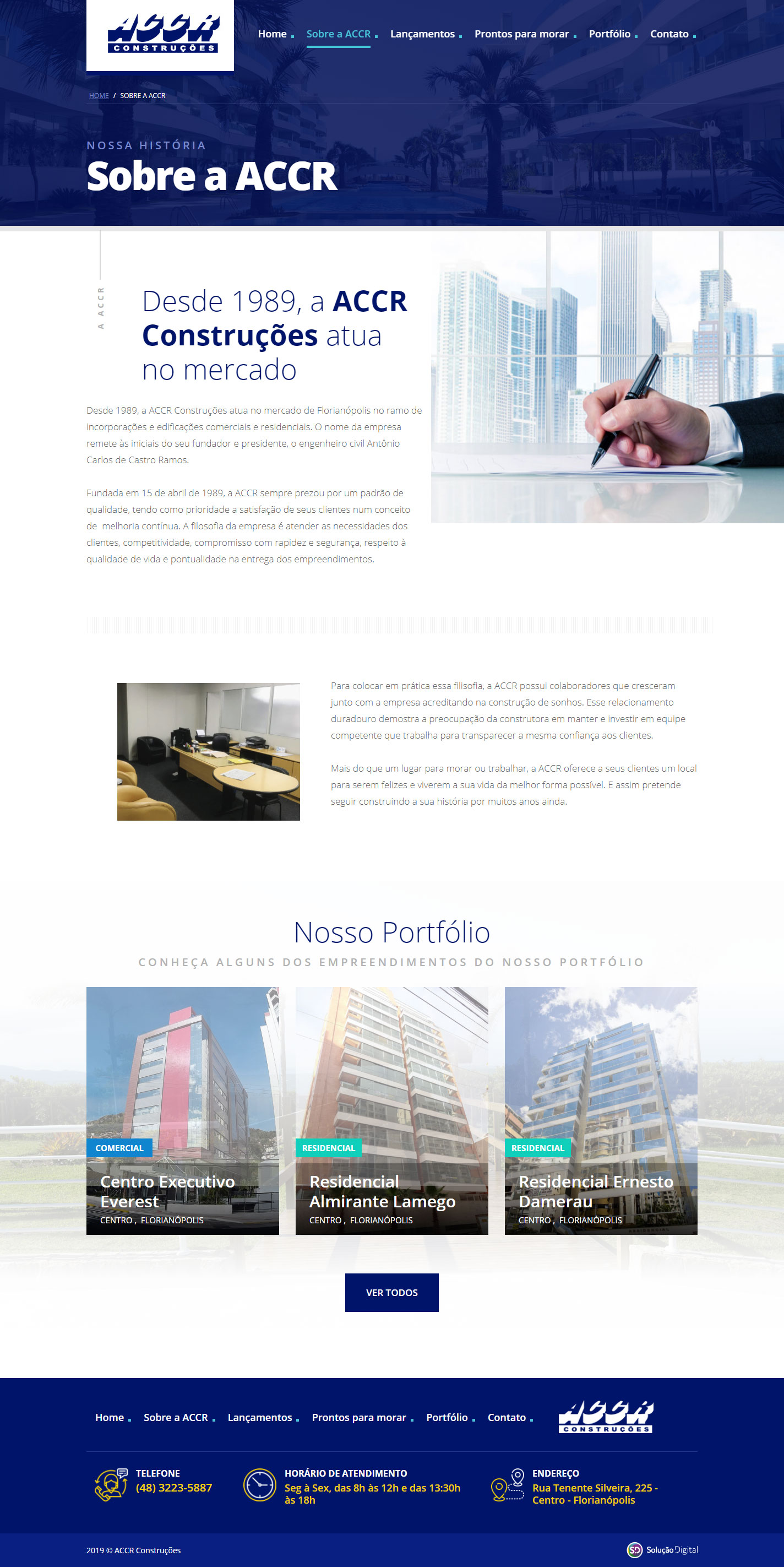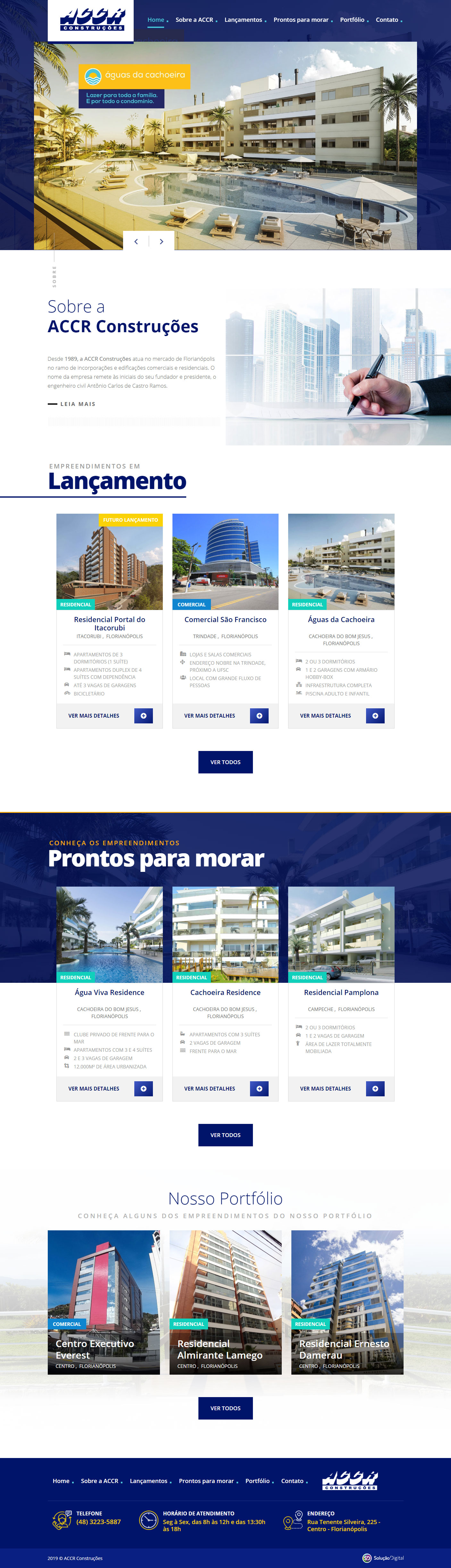 O novo site da ACCR Construções foi completamente criado e desenvolvido do zero pela Solução Digital. O principal objetivo do projeto era apresentar todos os empreendimentos da empresa de forma simplificada, fácil e atrativa aos usuários, priorizando o acesso através de dispositivos móveis.